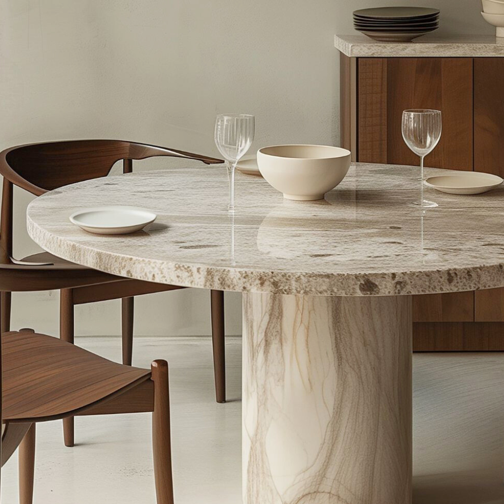- Stoelen met gebogen rugleuning en metalen basis: eigentijdse stijl, ideaal voor moderne eetkamers.